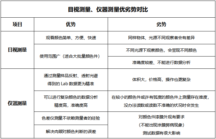 对颜色的判定一般有两种方式,一种是目视,另一种是通过仪器测量,这两种方法都是最为常见的测试方法,也有着不一样的优势与劣势。